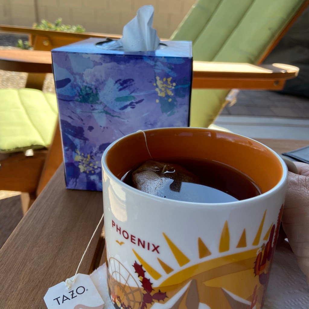 Lynn, my friend who writes poetry, brought me a cool Phoenix mug filled with a variety of soothing teas (I love hot tea but if I’m not drinking morning coffee—and I have not been—then I’m sick).
