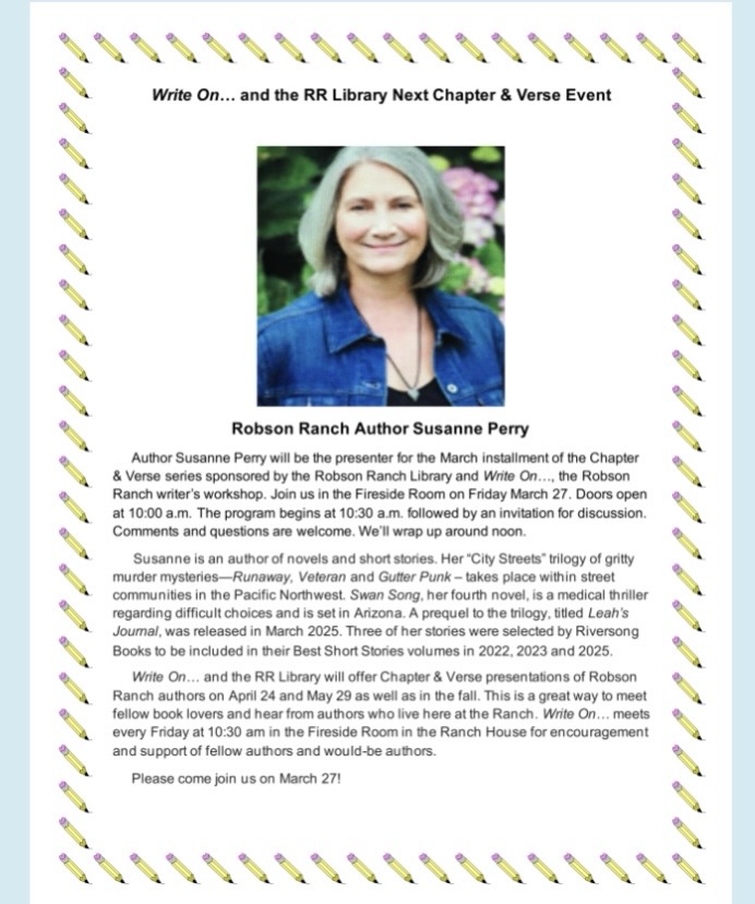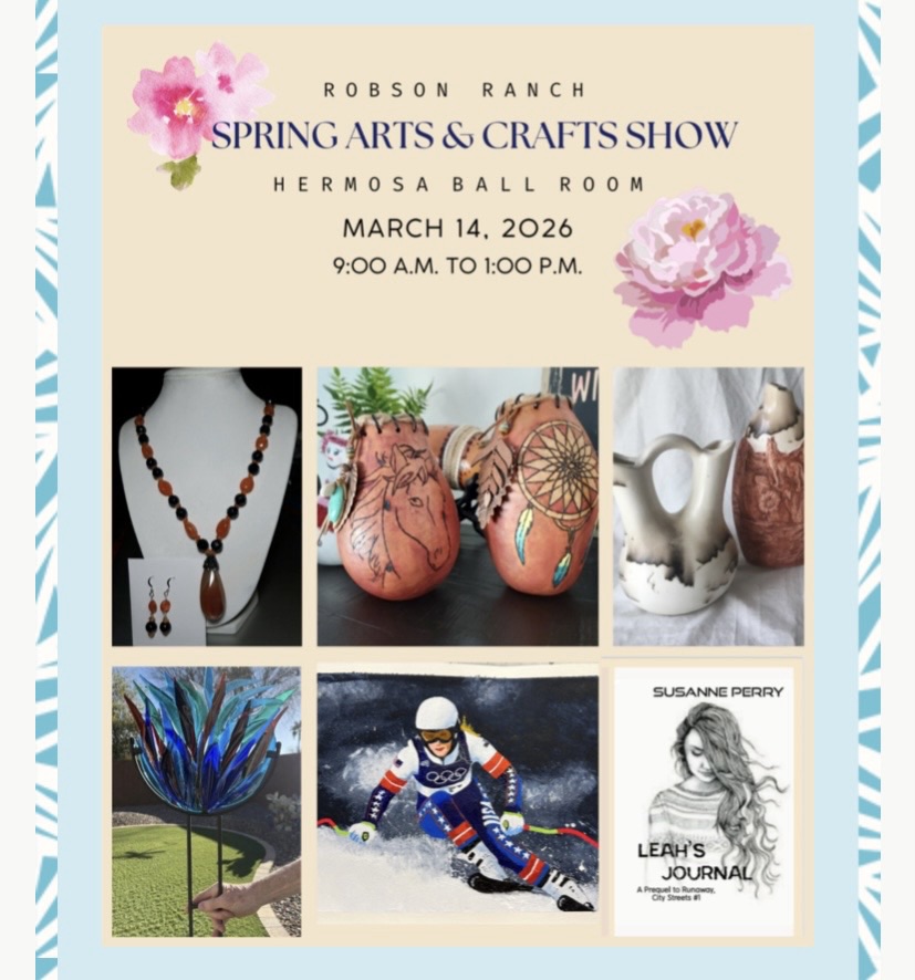 Readers! Visit the Robson Ranch Spring Craft Fair on Sat, March 14, 9-1pm in the Hermosa. Dozens of talented artists will have their wares on display for purchase. I’m thrilled to feature Leah’s Journal, prequel novella to the City Streets Trilogy. Autographed copies $8. Stop by and say hello.